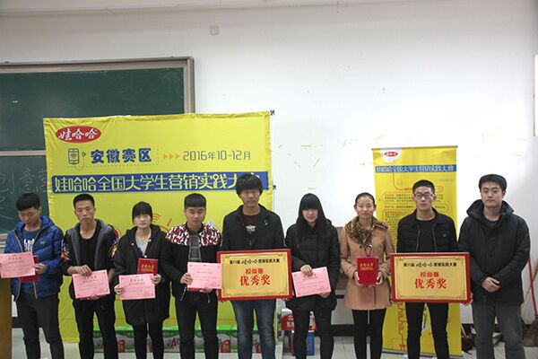 经过一个月的紧张比赛👜,由院创业指导委员会、院就业办🕴、院团委联合举办的第八届全国大学生哇哈哈营销实践大赛校级赛圆满落下帷幕。12月7日下午🎱,在3202教室隆重举行了第八届全国大学生哇哈哈营销实践大赛校级赛的颁奖典礼。院创业指导委员会副主任😤、财经分院院长李德明🏋🏻♀️,杭州娃哈哈集团安徽分公司高校市场总监陈晓春先生,学院团委洪丽老师,财经分院辅导员盛婷婷老师应邀参加本次颁奖典礼🦆。