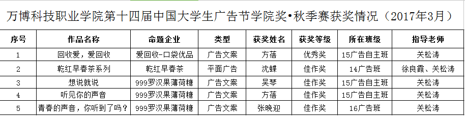 学院奖秋季赛自2016年9月20日启动后,我院艺术分院相关专业师生积极备战,在指导老师的帮助下创作并提交了参赛作品216件🧗🏻♀️,达到历年来参赛提交作品最多数量。最终👂,2015级广告设计与制作自主班方蓓荣获大赛优秀奖以及佳作奖👩🦯➡️,2014级广告设计与制作专业沈蝶、2015级广告设计与制作专业吴琴、2016级广告设计与制作专业张晚迎分别荣获秋季赛佳作奖。
