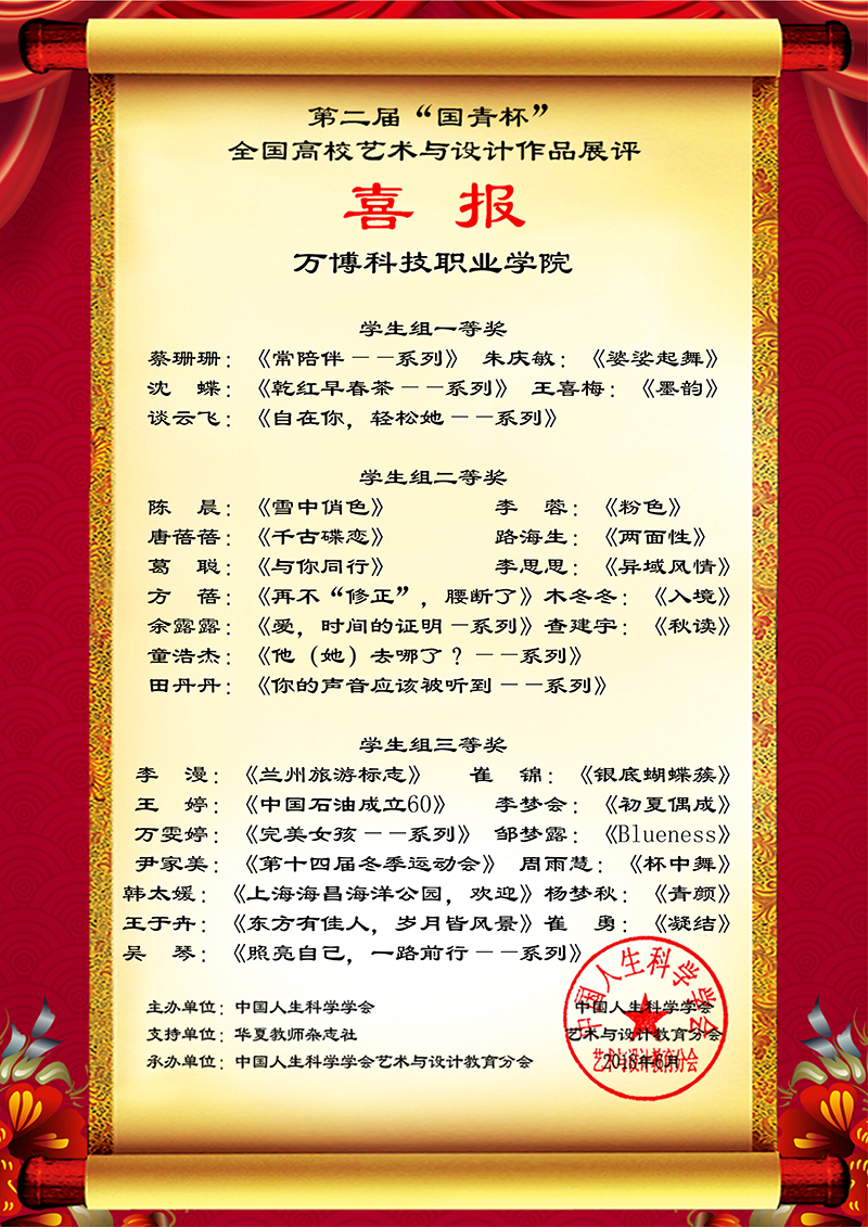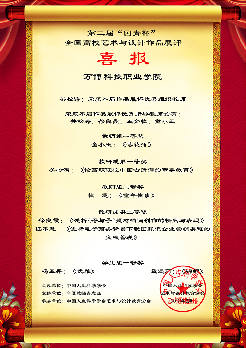 经过组委会专家评委的评审,最终我院共37件作品获奖,其中9件作品获得本届比赛一等奖🪞,童小玉老师提交的《落花雨》获教师组一等奖😥,关松涛老师提交的参赛作品《论高职院校中国古诗词的审美教育》获得教研成果一等奖💗,蔡珊珊同学提交的《常陪伴——系列》等7件作品获得本届比赛学生组一等奖🗑;桂慧老师的《童年往事》荣获教师组二等奖👨🏼🏭,徐良霞老师提交的《浅析<母与子>题材油画创作的情感与表现》以及任本慧老师提交的《浅析电子商务背景下我国服装企业营销渠道的突破管理》获得教研成果二等奖,陈晨提交的《雪中俏色》、李蓉的《粉色》等12件学生参赛作品获得学生组二等奖🍭,其中教师参赛作品3项,学生参赛作品12项;李漫同学的《兰州旅游标志》✡︎、王婷同学提交的《中国石油成立60》等13件参赛作品获得本届比赛三等奖。