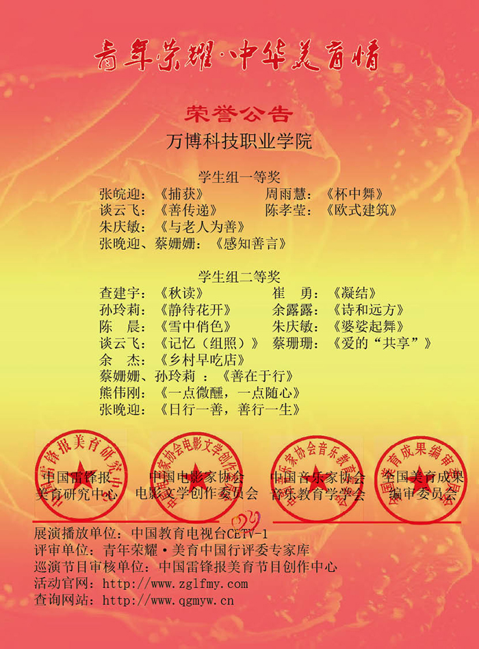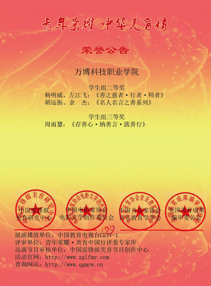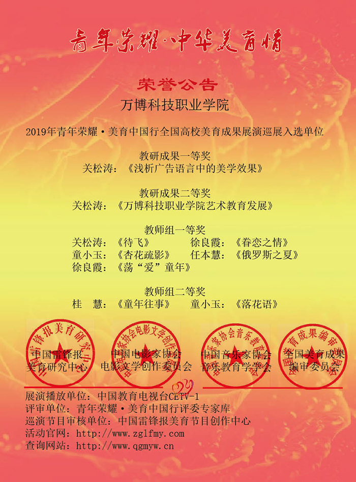 12月24日,从主办方传来喜讯🥽,在由中国雷锋报美育研究中心🐩、中国电影家协会电影文学创作委员会、中国音乐家协会音乐教育学学会、全国美育成果编审委员会联合主办的“2019年青年荣耀•中华美育情全国高校美育成果展演”比赛中,我院师生提交的参赛作品喜获佳绩🙎。