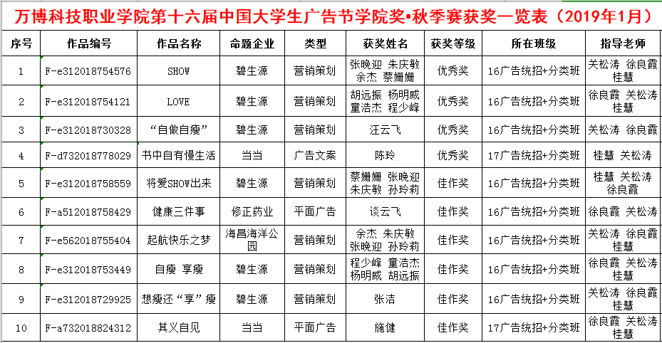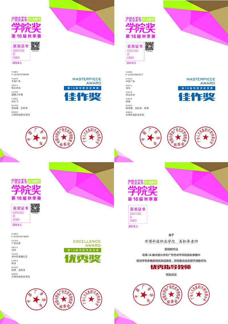 我院师生在此次比赛中再获佳绩✍🏻,收获优秀奖4项,佳作奖6项,且获奖作品类型较往年实现了突破性,含平面设计👨👩👧📖、广告文案和营销策划案等类型。2016级广告设计与制作专业的张晚迎等9名同学以及2017级广告设计与制作专业陈玲同学荣获大赛“优秀奖”,2016级广告设计与制作专业蔡姗姗等11名同学和2017级广告设计与制作专业施健荣获大赛“佳作奖”。此外🐳,艺术分院广告学教研室主任关松涛和专职教师徐良霞、桂慧分别荣获学院奖秋季赛的“优秀指导老师奖”。