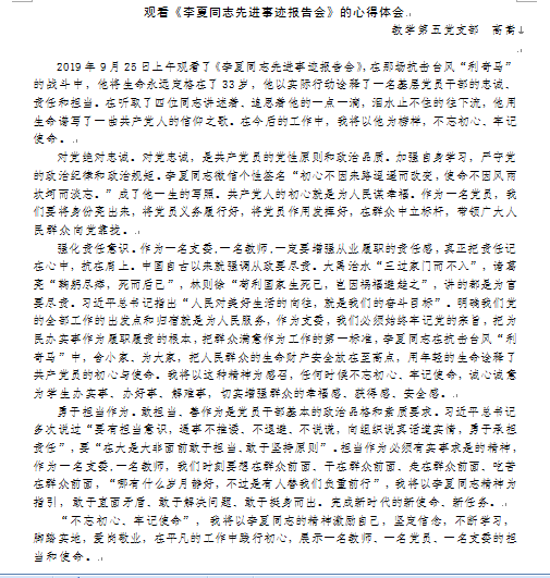 教学第五党支部积极贯彻落实校党委“不忘初心🧑🎓、牢记使命”主题教育领导小组办公室和省、市委组织部关于学习李夏同志先进事迹党员教育电视片《生如夏花》的通知👆🏽,支部组织全体党员利用手机🚚、电脑等渠道进行自学收看。