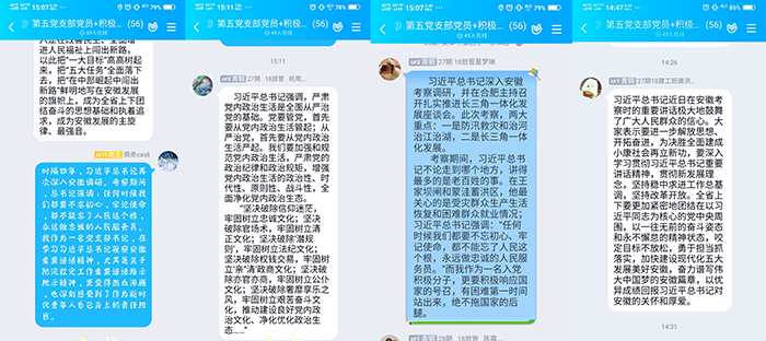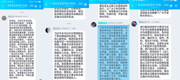 2020年8月18日至21日,习近平总书记亲临安徽视察🧏🏻,作出一系列重要指示,发表一系列重要讲话。教学第五党支部组织支部积极分子、党员开展线上学习讨论🦸🏿♀️、交流学习心得🧑🦽➡️,掀起学习贯彻习近平总书记视察安徽重要讲话精神的热潮。