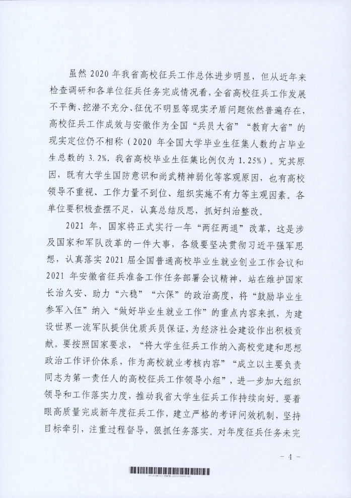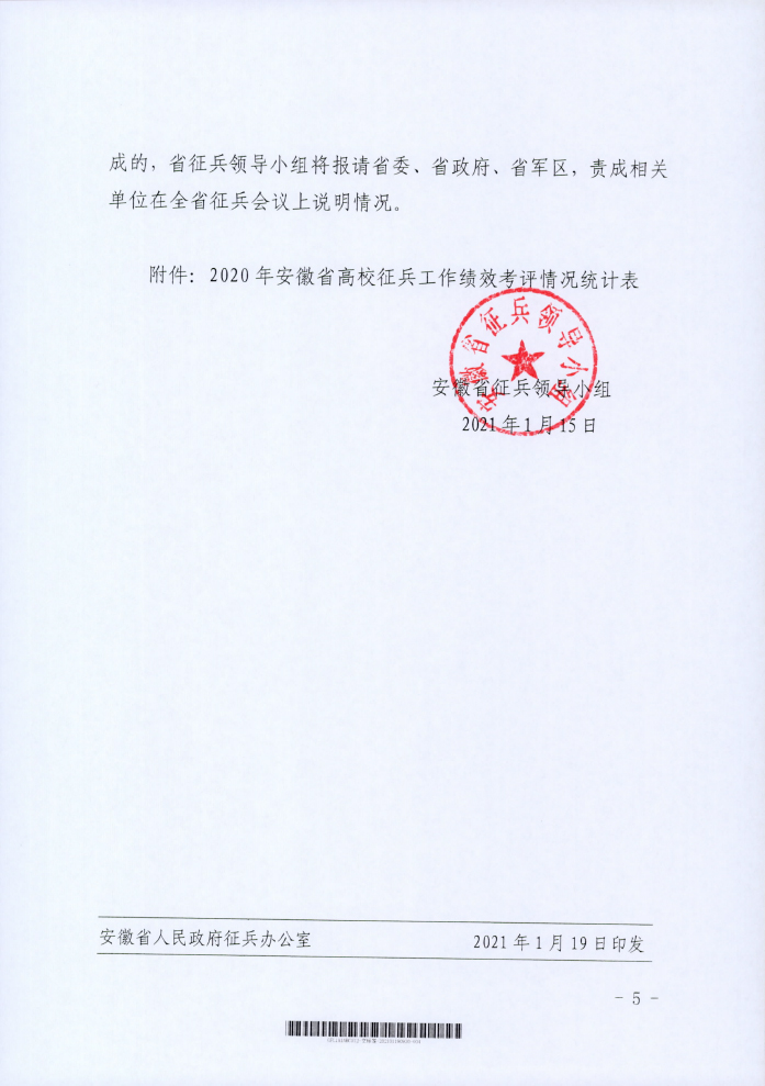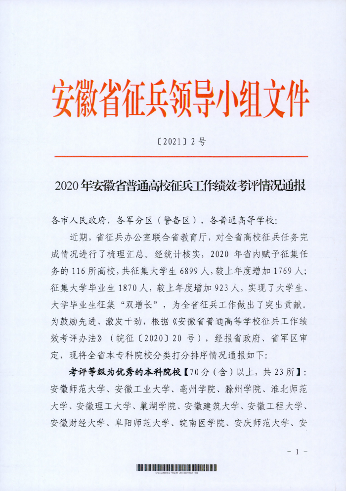 彩神Vll学院积极落实大学生征兵任务,鼓励在校大学生投笔从戎。2020年,学校全年征兵计划为25人,实际入伍人数达到46人,超额完成上级部门下达的任务⛹️,在2020年安徽省普通高校征兵绩效评级中被评为“优秀的专科院校”。