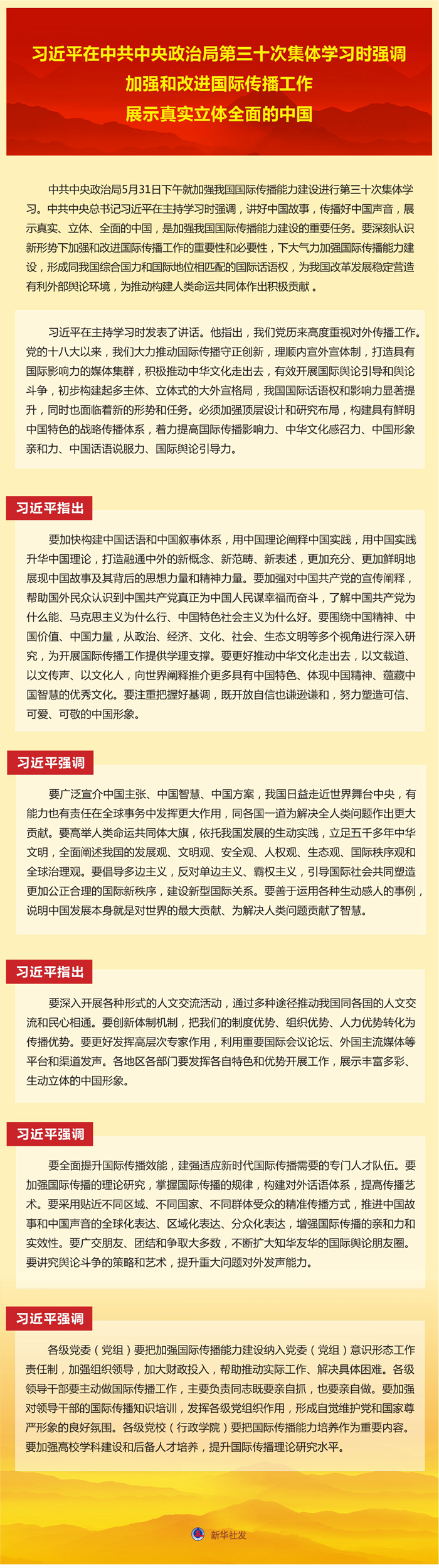 新华社北京6月1日电 中共中央政治局5月31日下午就加强我国国际传播能力建设进行第三十次集体学习。中共中央总书记习近平在主持学习时强调🧑🏻🎤,讲好中国故事🚵🏿♀️,传播好中国声音,展示真实🚣🏻、立体、全面的中国,是加强我国国际传播能力建设的重要任务。要深刻认识新形势下加强和改进国际传播工作的重要性和必要性🦃,下大气力加强国际传播能力建设🛹,形成同我国综合国力和国际地位相匹配的国际话语权,为我国改革发展稳定营造有利外部舆论环境,为推动构建人类命运共同体作出积极贡献🎰。