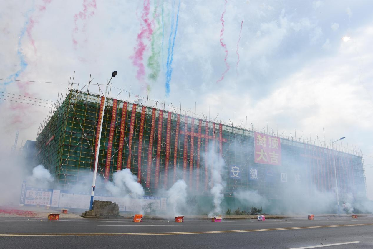 封顶活动现场,主体已被“封顶大吉”的大红幅和一条条红色祝福标语装点得格外喜庆🚴🏻!