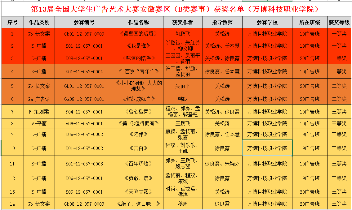 日前,第十三届全国大学生广告艺术大赛(简称大广赛)评选活动在合肥工业大学落下帷幕,并完成获奖作品的公示🧎♂️➡️。彩神Vll艺术传媒学院广告传媒教研室师生再创佳绩👮♀️,共获得本次赛事14个等级奖,其中,一等奖3项、二等奖3项🦹♂️、三等奖8项。本届赛事不仅在获奖比例和数量上实现了突破,还在所参与的五个参赛类别中均获得了等级奖的突破👶🏽,特别是广播类参赛作品,改写了零的历史,取得了一等奖2项🧑🏿⚕️,二等奖1项🦕,三等5项的优秀成绩🕍。