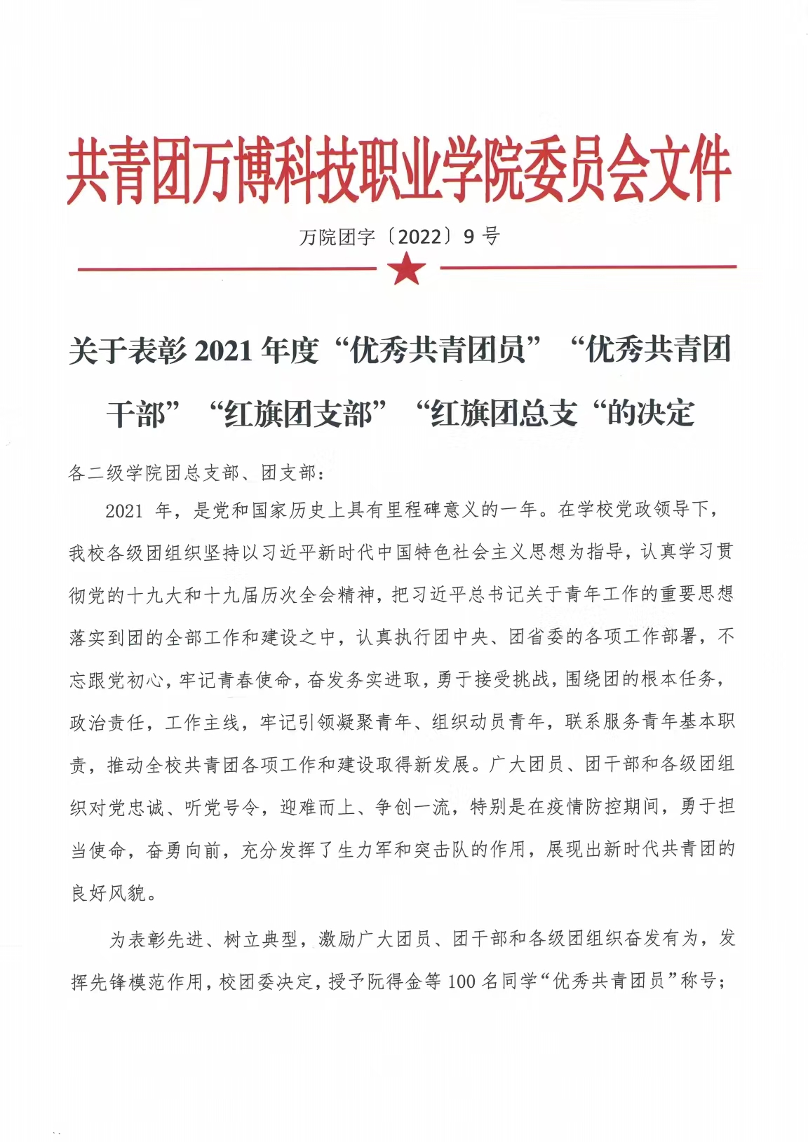 关于表彰2021年度“优秀共青团员”“优秀共青团干部”“红旗团支部”“红旗团总支”的决定
