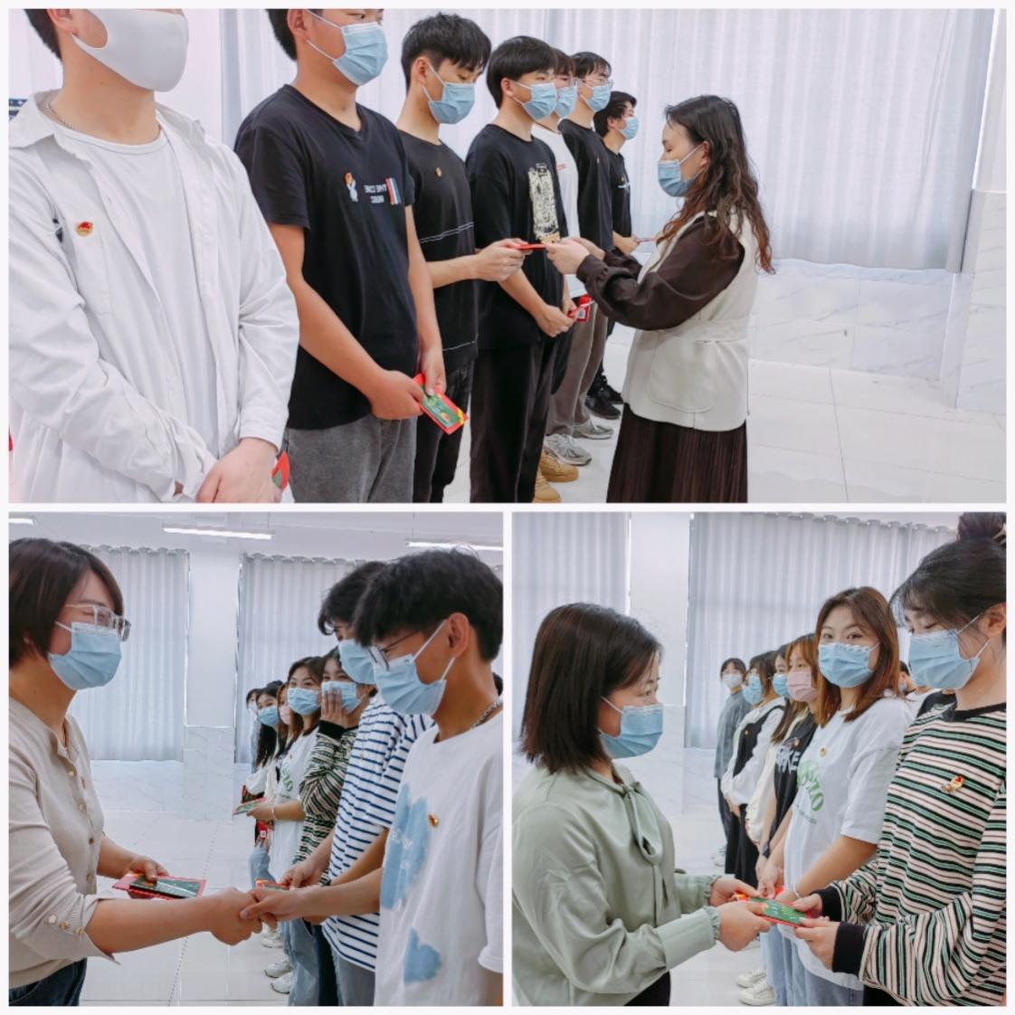 伴着雄壮的国歌声,入团仪式正式开始,主持人阐述了举办此次入团仪式的意义,三位书记为所有新团员门颁发团员证和团章,并逐一佩戴团徽🤽🏻♂️。在校团委老师许鑫宇的带领下,佩戴整齐的新团员们在团旗前庄严宣誓。
