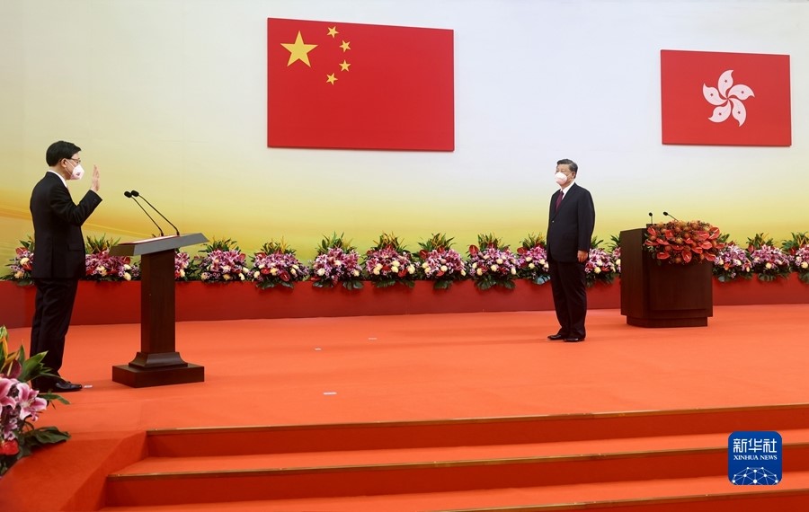 7月1日上午,庆祝香港回归祖国25周年大会暨香港特别行政区第六届政府就职典礼在香港会展中心隆重举行。中共中央总书记、国家主席🦵🏻、中央军委主席习近平出席并发表重要讲话🎅🏿。这是习近平监誓🙎🏿,香港特别行政区第六任行政长官李家超宣誓就职。 新华社记者 鞠鹏 摄