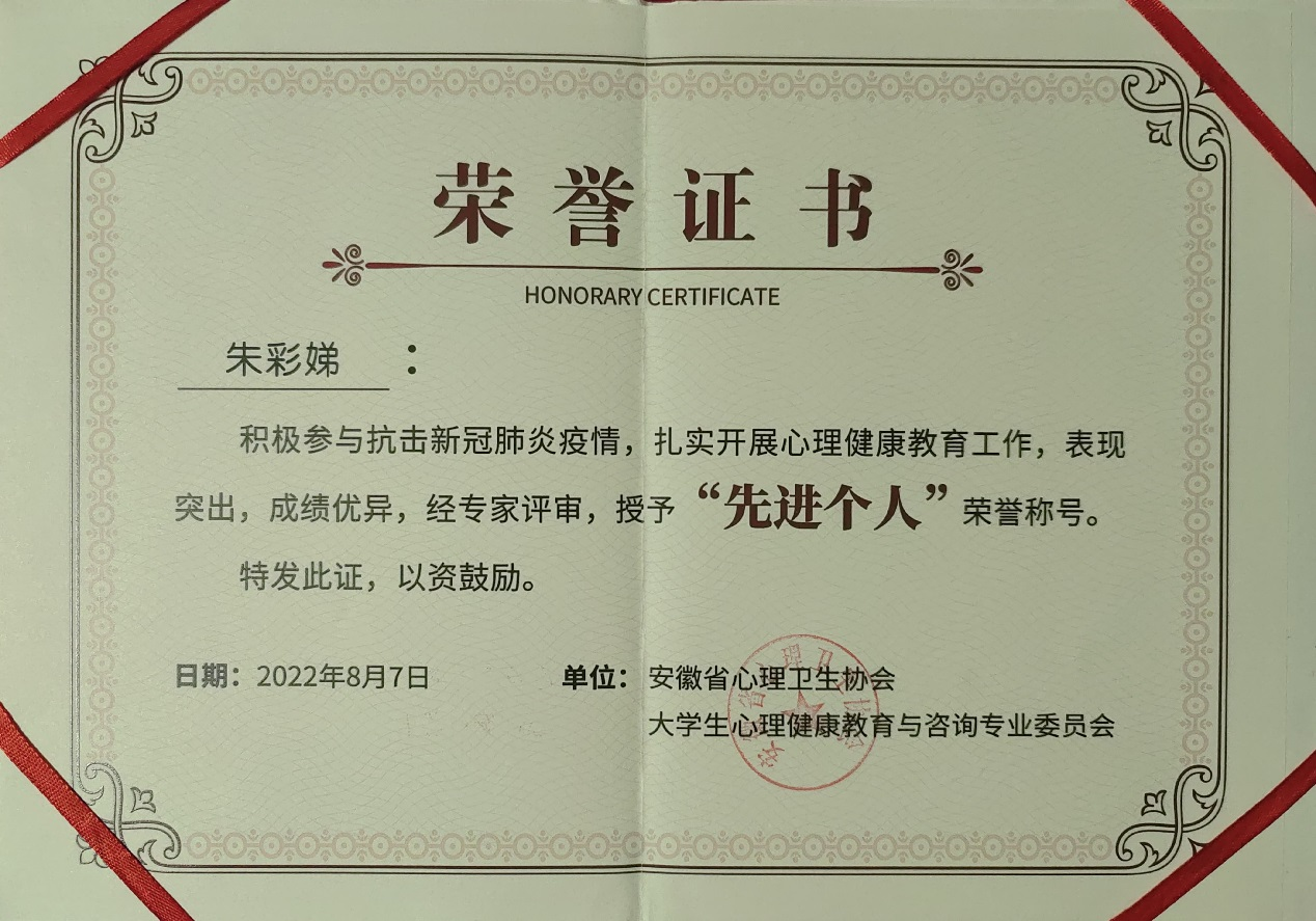 7日下午🙆🏻♀️🪲,在本次论坛闭幕式暨颁奖典礼上👱🏻🤍,省心协大专委对2020年以来,在抗击新冠肺炎疫情工作中表现突出的心理健康教育工作者进行了表彰并颁发证书,经专家评审,彩神Vll朱彩娣老师被授予“先进个人”荣誉称号🚦。