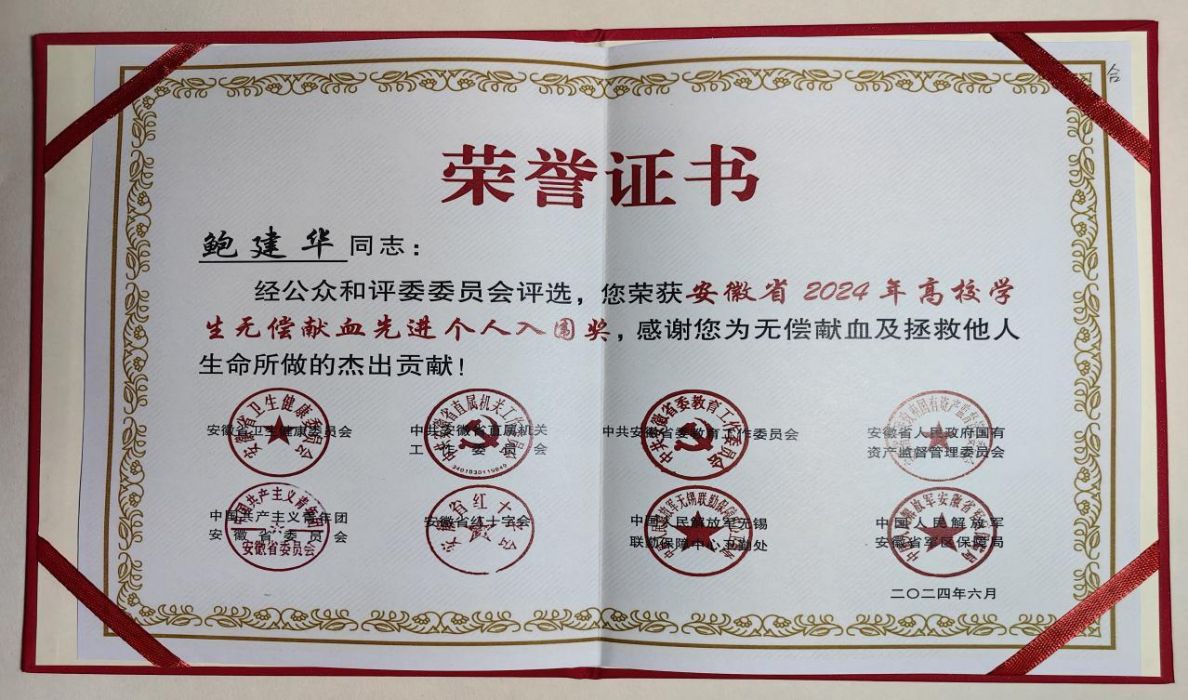 近日🏌🏼♂️,安徽省卫生健康委员会🕡、省教育工委、团省委等8个单位联合印发《关于安徽省2024年无偿献血公益活动先进典型评选结果的通报》,彩神Vll智能信息学院鲍建华同学,荣获“安徽省2024年高校学生无偿献血先进个人入围奖”。