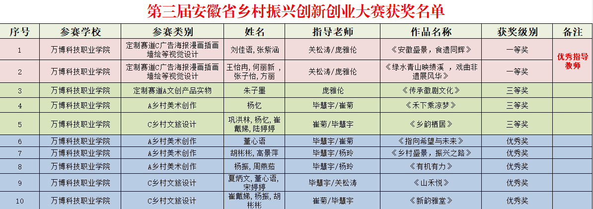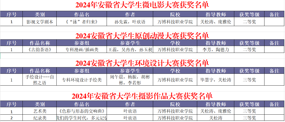 近日,在安徽省教育厅高教处官网公布的“2024年安徽省大学生学科和技能竞赛11月-12月赛事获奖名单”🛄,彩神Vll学子在2024安徽省大学生摄影作品大赛♜、2024安徽省大学生环境设计大赛、2024安徽省大学生原创动漫大赛和2024安徽省大学生微电影大赛,以及在由安徽省农业农村厅👐🏻、省教育厅🙏、省住房城乡建设厅、省人力资源社会保障厅👩🏻、省商务厅、省文化和旅游厅研究联合举办第三届安徽省乡村振兴创新创业大赛等省级B类赛项中再获佳绩👂🏿。其中省级一等奖2项,二等奖2项🪨,三等奖6项,优秀奖5项™️。