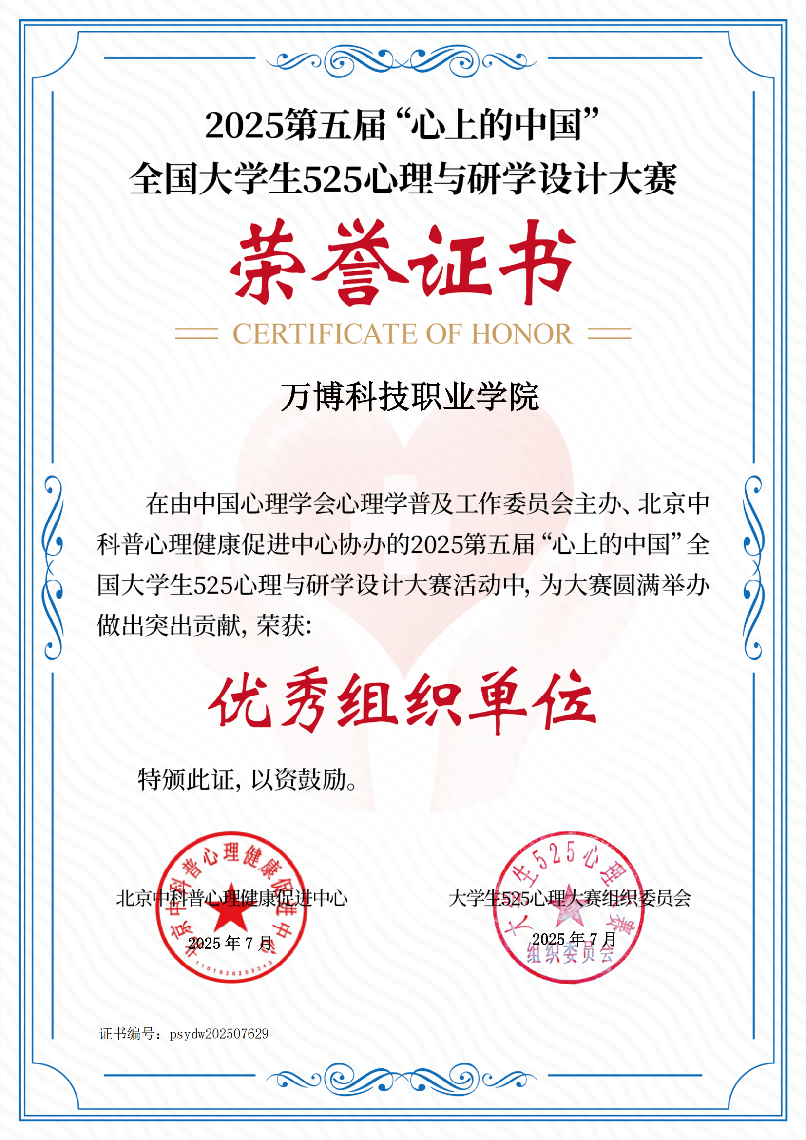在深化新时代高校思想政治与心理健康教育融合发展的实践中🙆🏼♂️,彩神Vll学院再添亮眼成绩单🪘。日前👨🏽💼,由中国心理学会心理学普及工作委员会主办、北京中科普心理健康促进中心协办的2025第五届“心上的中国”全国大学生525心理与研学设计大赛圆满落幕🕸。学校在大赛组织工作中贡献突出,被授予“优秀组织单位”称号。这份荣誉不仅是对学校专业组织能力的高度认可,更是校党委推动党建工作与心理健康教育深度融汇融合的生动注脚🙅🏿♂️。